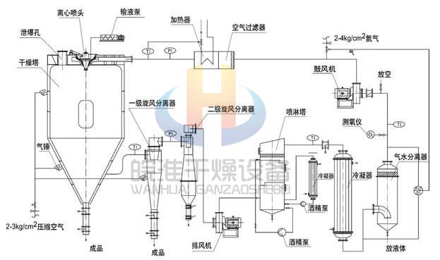 閉式循環(huán)噴霧干燥機系統(tǒng)由噴霧干燥機主機、帶空氣過濾器的加熱器、鼓風(fēng)機、水氣分離器、大小冷卻塔、噴淋塔、排風(fēng)機、一級旋風(fēng)分離器、二級旋風(fēng)分離器、泵、測氧儀以及管路與控制閥等組成。
